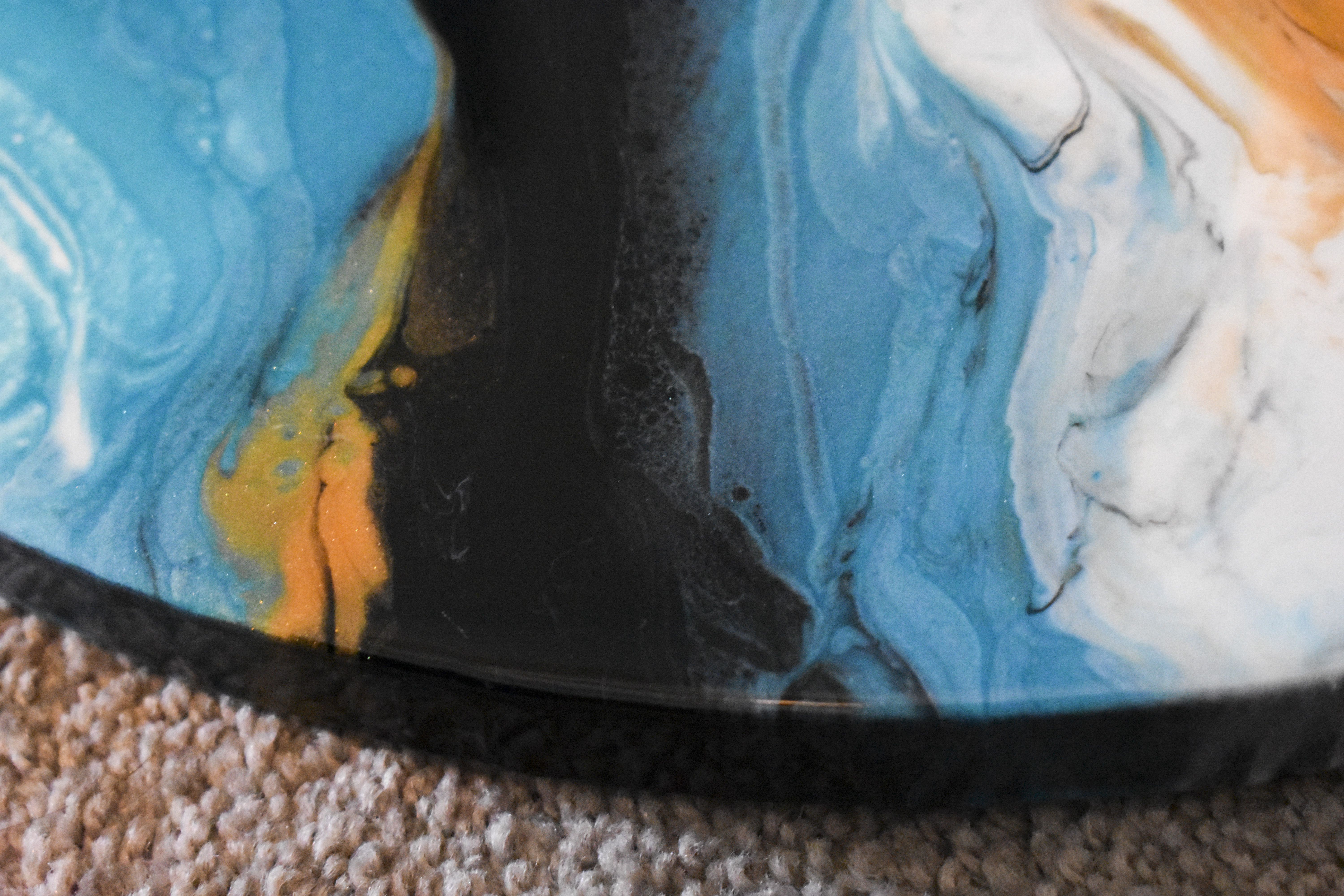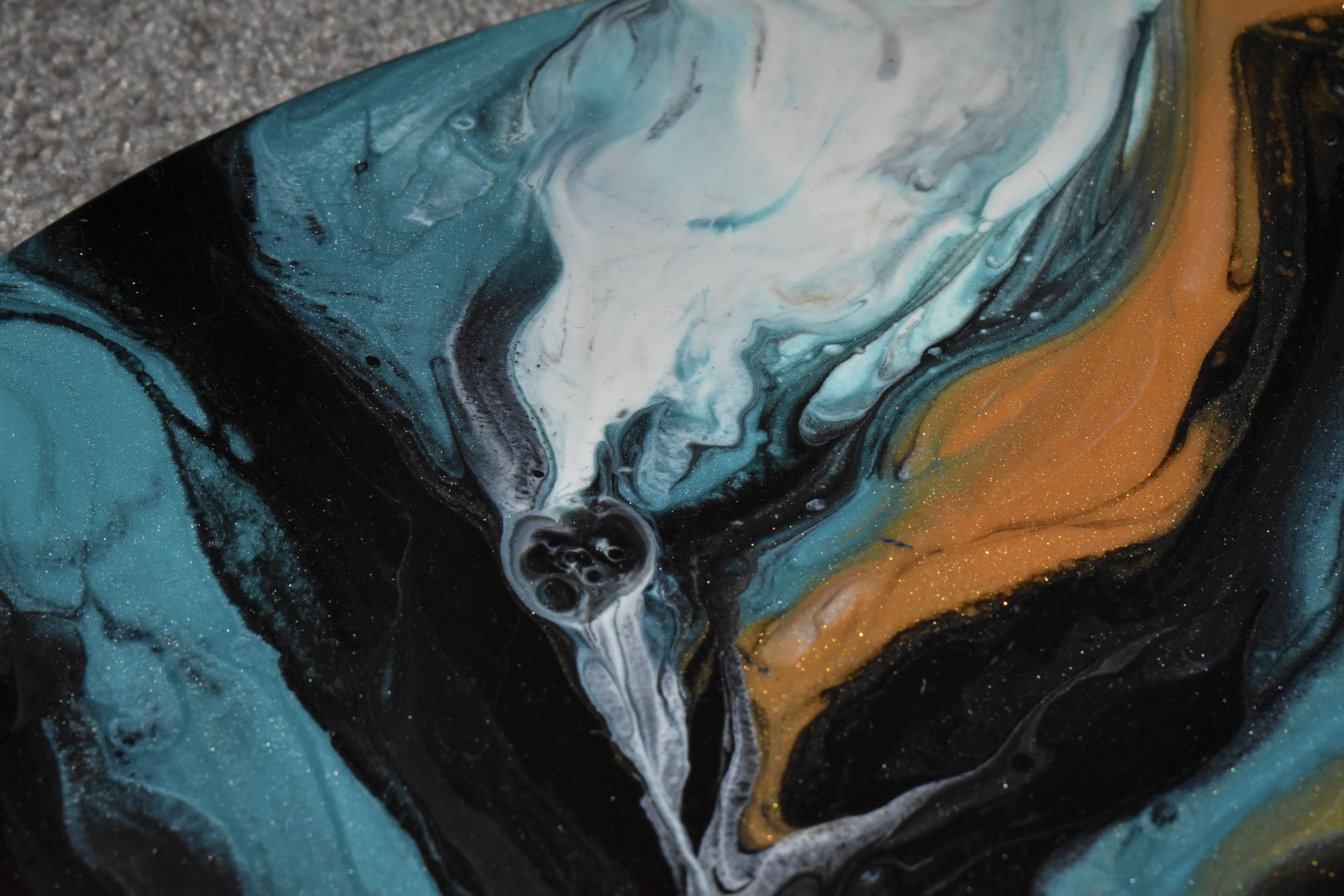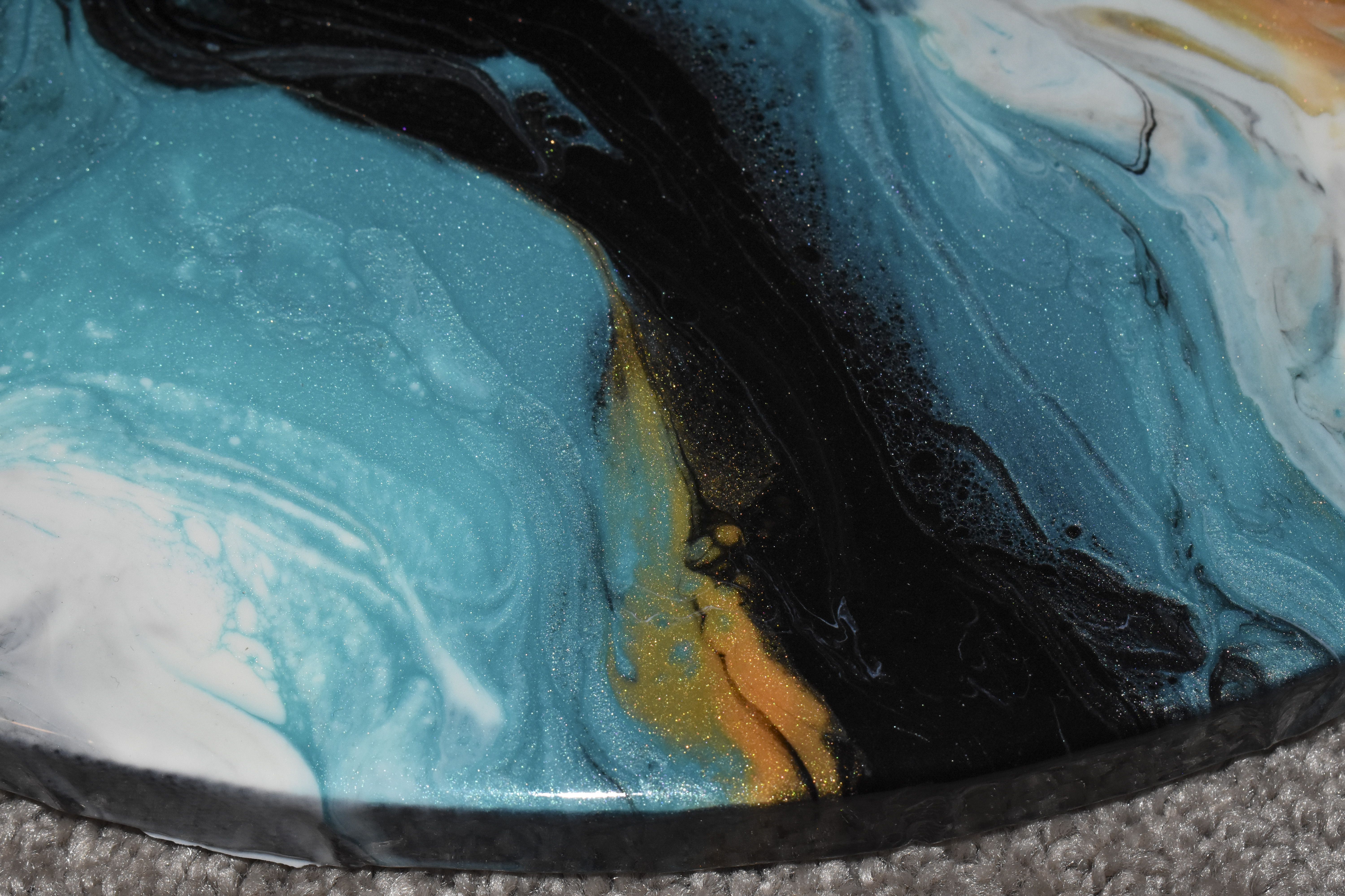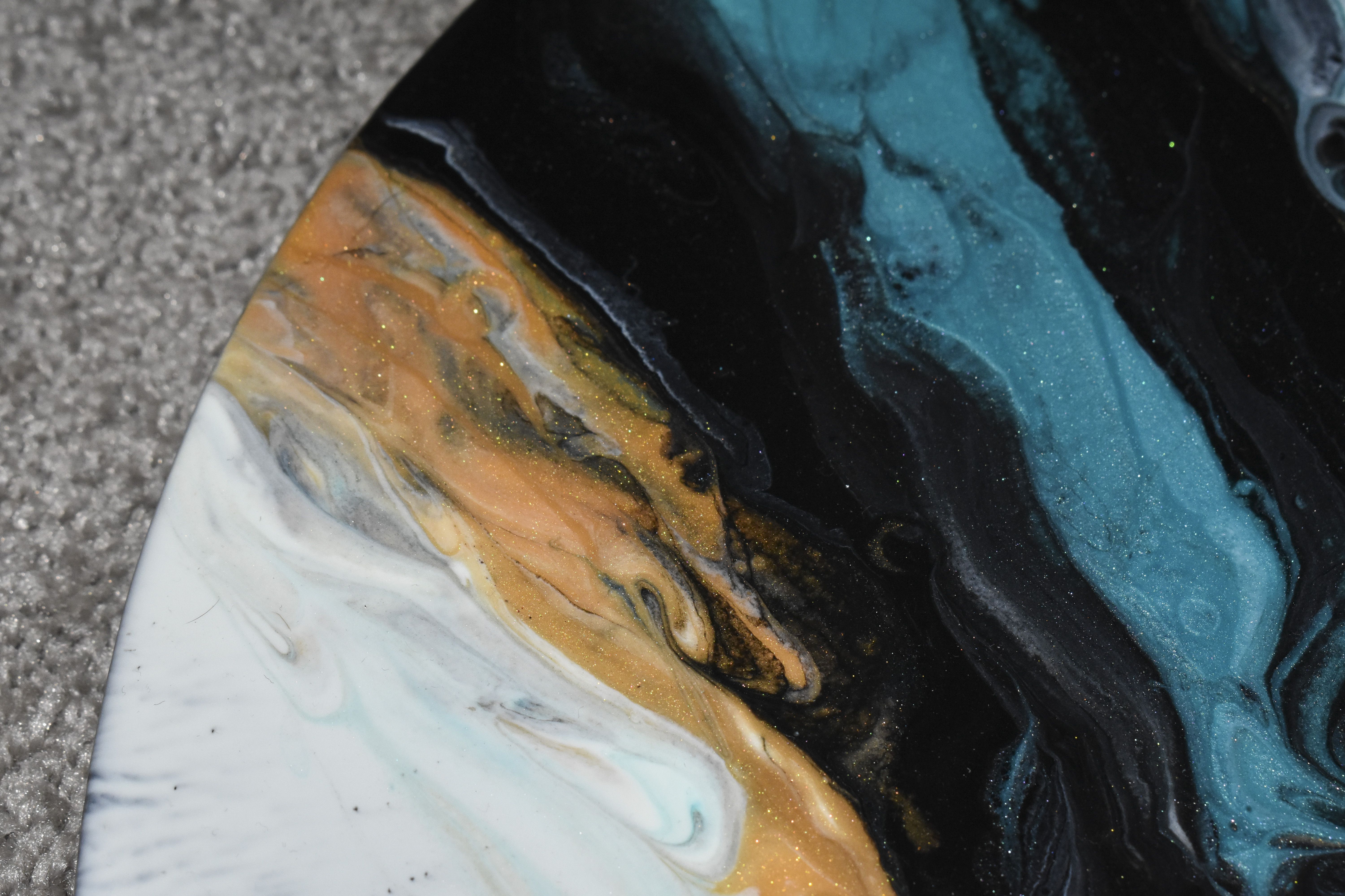 Resin mixed with acrylics on a 16" round canvas. Glass like surface! Resin is an amazing medium to work with. It creates beautiful details when torching it. You can also use additives such as acetone and denautured alcohol to the mix and that creates other details. It's amazing I just love working with it!